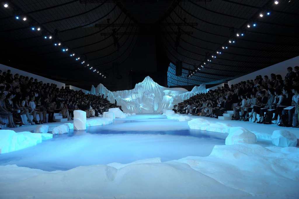 no this isn’t a scene from ice age, its the Chanel show set around the artic, which includes having a massive ice berg slowly falling apart as the decor.