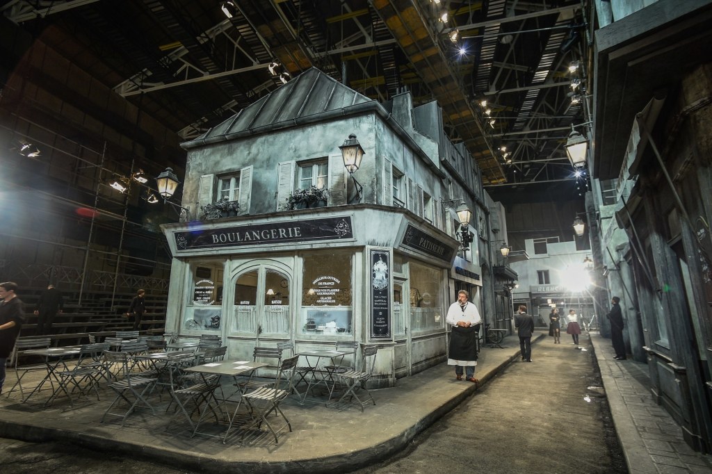 Old Parisian streets theme, with seats set out in front of cafes and shops for the guests of the show so they can take part in the show.